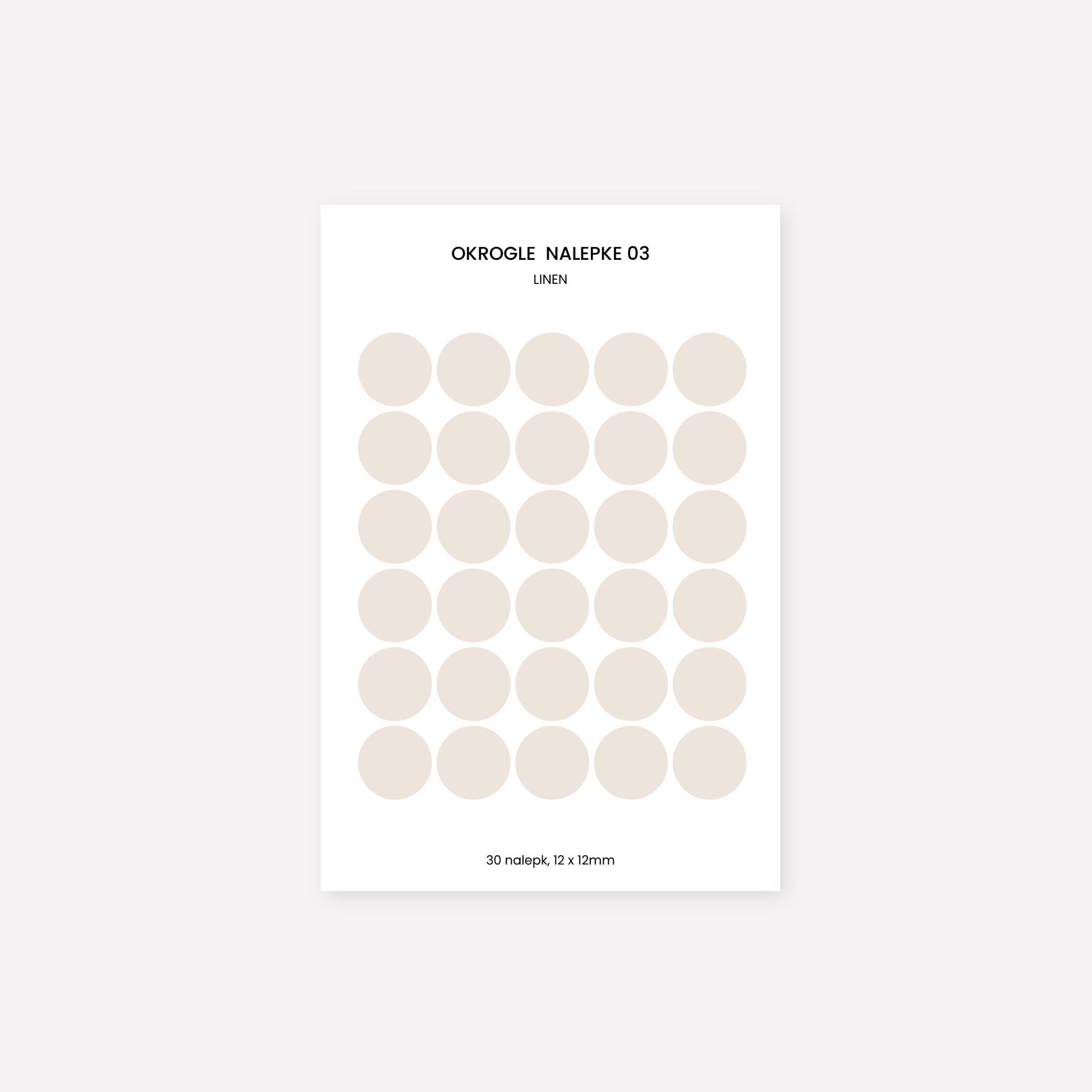 30 okroglih mat nalepk v nevtralnih barvah. Idealno za označevanje pomembnih dogodkov, color-blocking sistem ali pa le za okrasitev.