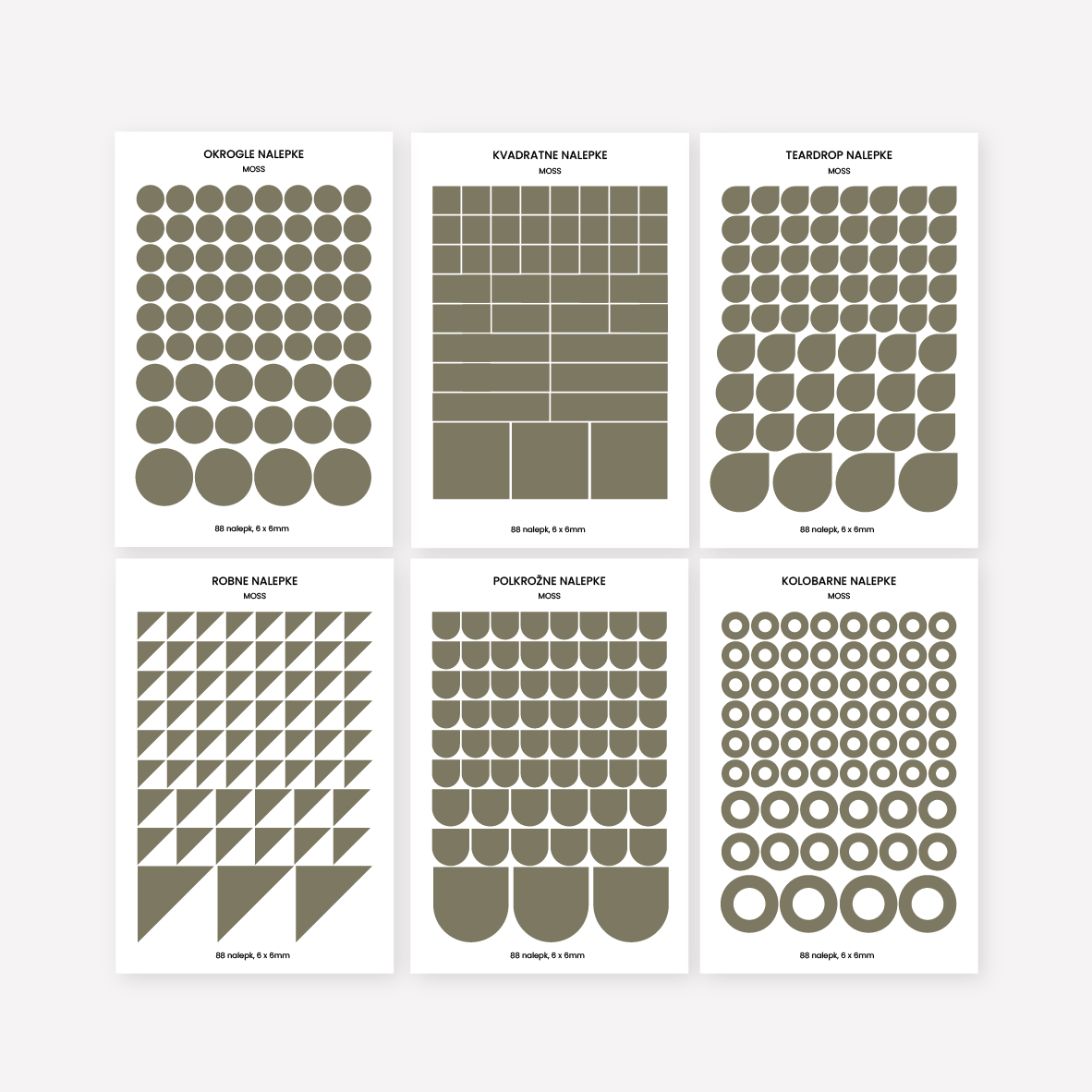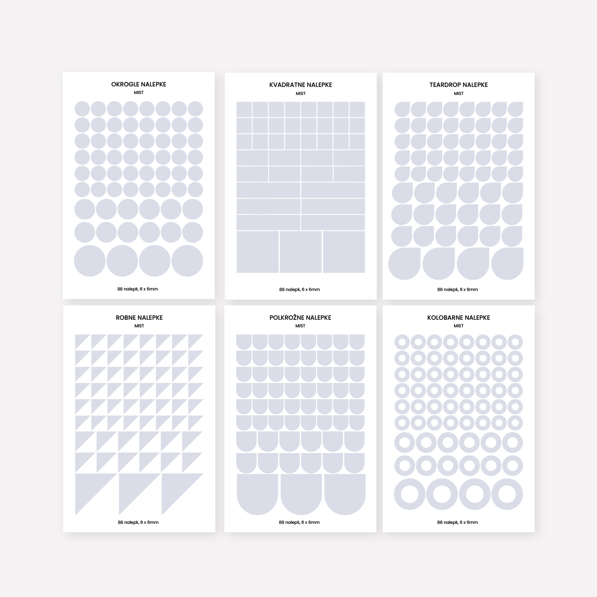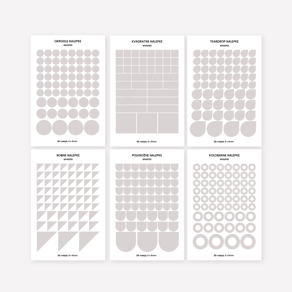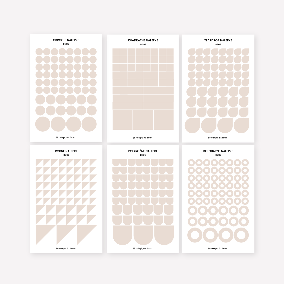 Set minimalističnih nalepk v nevtralnih barvah - v šestih različnih oblikah in treh velikostih. Idealno za označevanje pomembnih dogodkov, color-blocking sistem ali pa le za okrasitev.