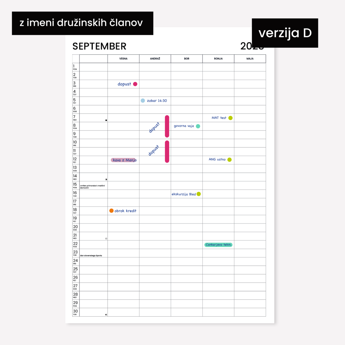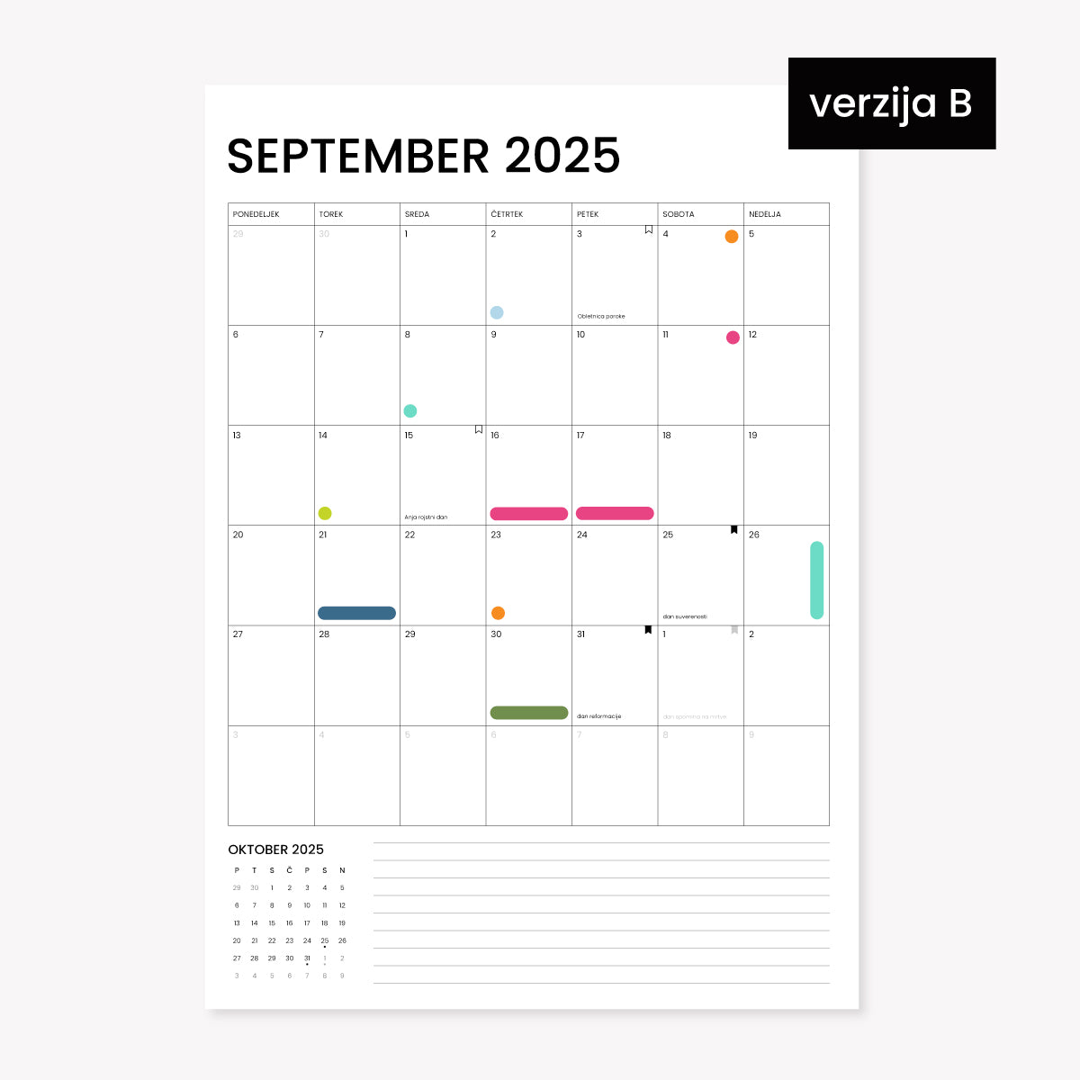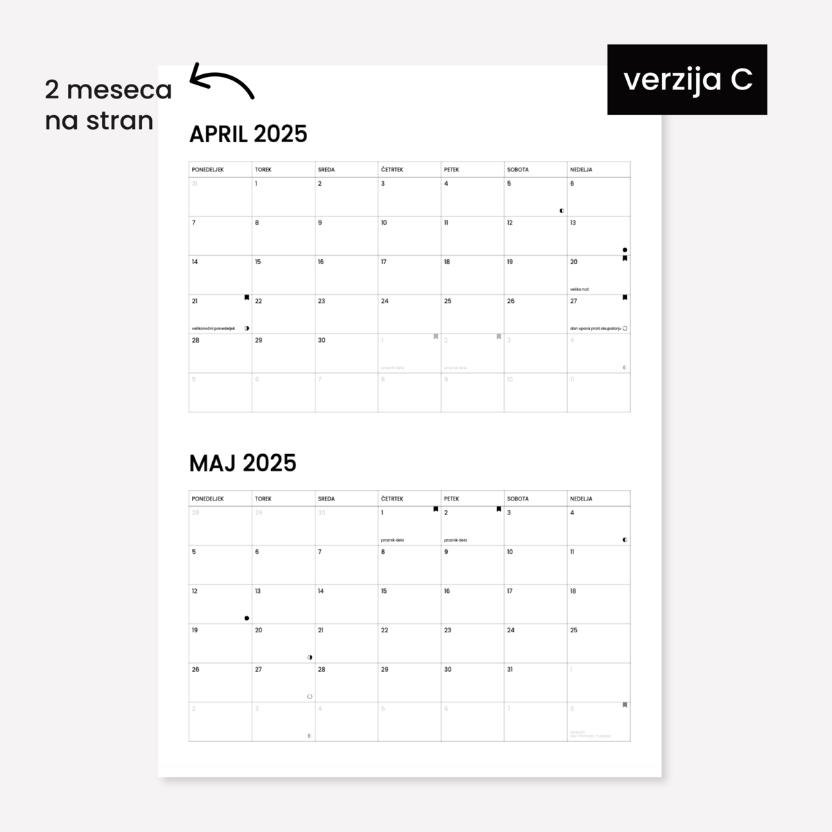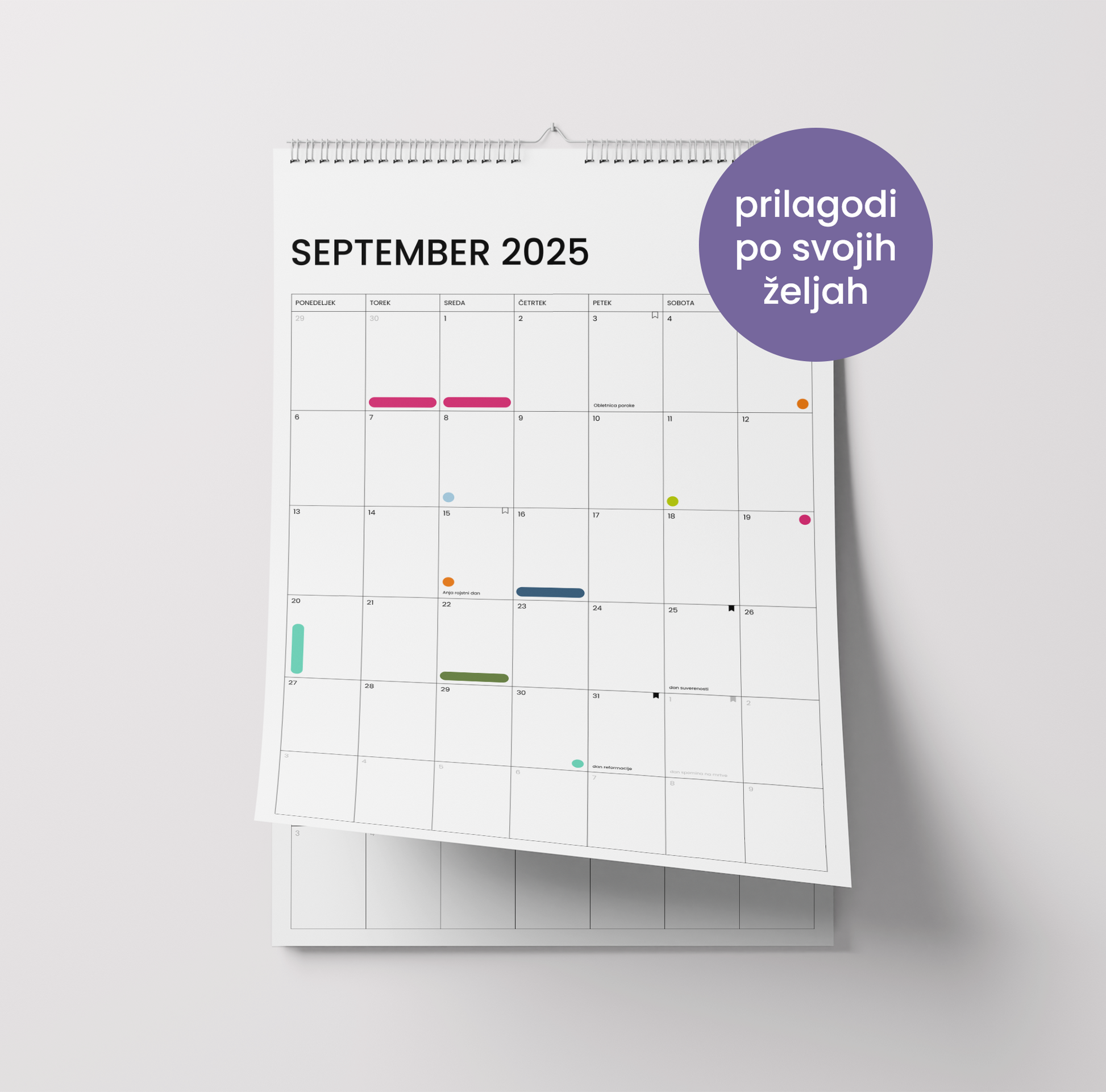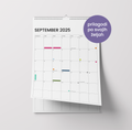 Minimalističen koledar v velikosti A4, zasnovan tako, da se popolnoma prilagodi tvojemu življenju. Na vsako stran lahko dodaš svoje pomembne datume, barvno označiš dogodke in si ustvariš vizualno pregleden pregled leta. Minimalistična zasnova poskrbi, da bo koledar lepo dopolnil vsak prostor — od pisarne do domače stene.