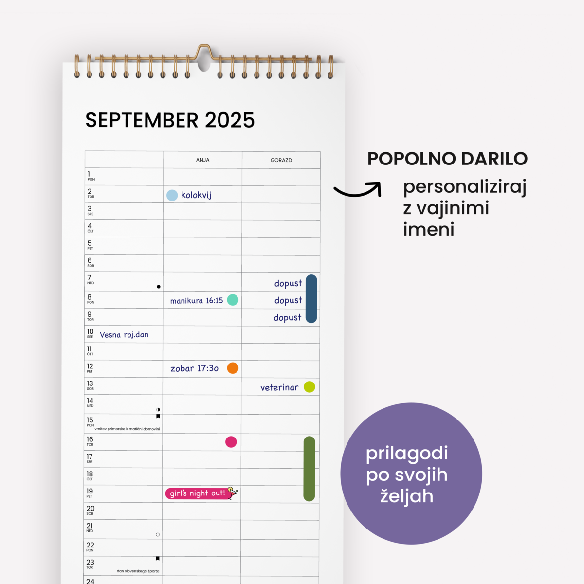 Koledar lahko tudi personaliziraš z vajinimi imeni.