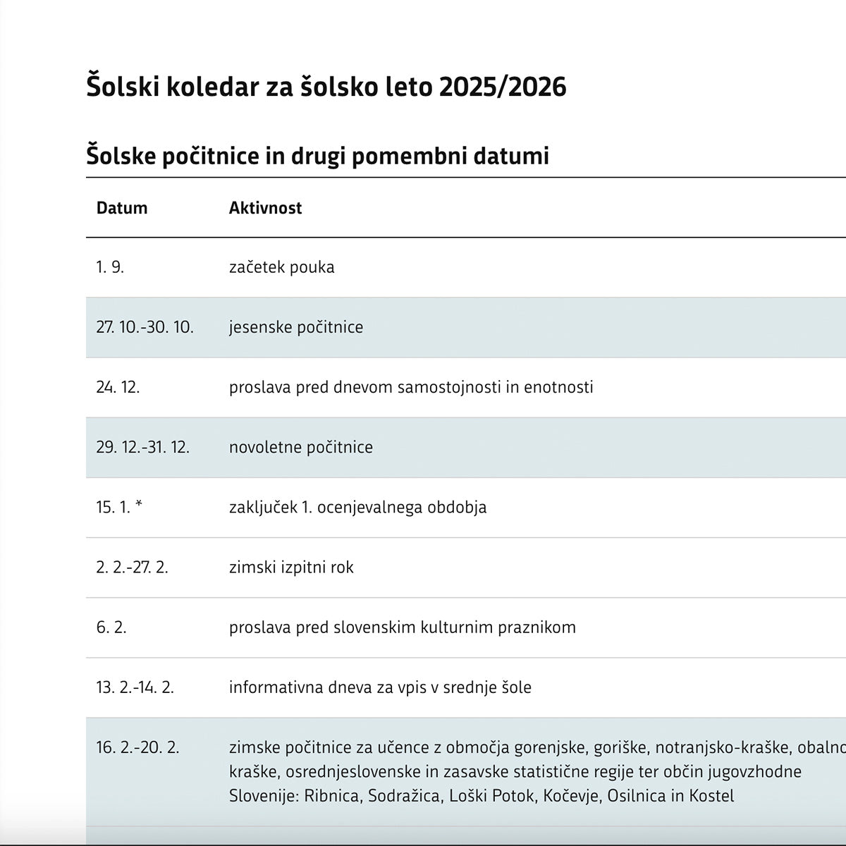 Dodaj datume iz uradnega šolskega koledarja
