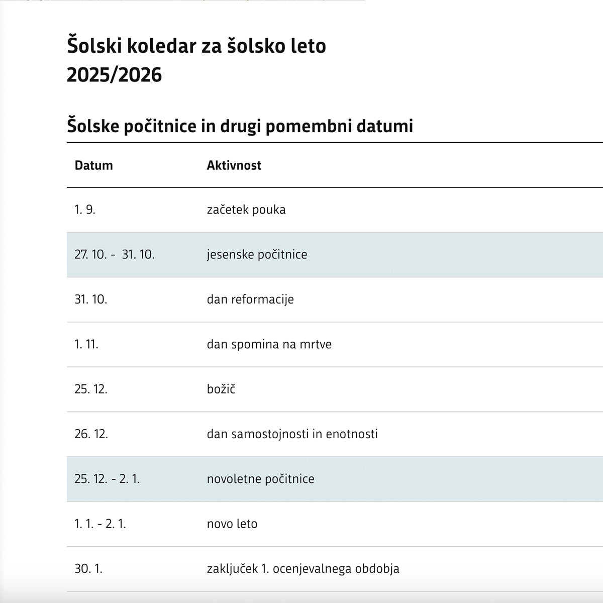 Dodaj datume iz uradnega šolskega koledarja