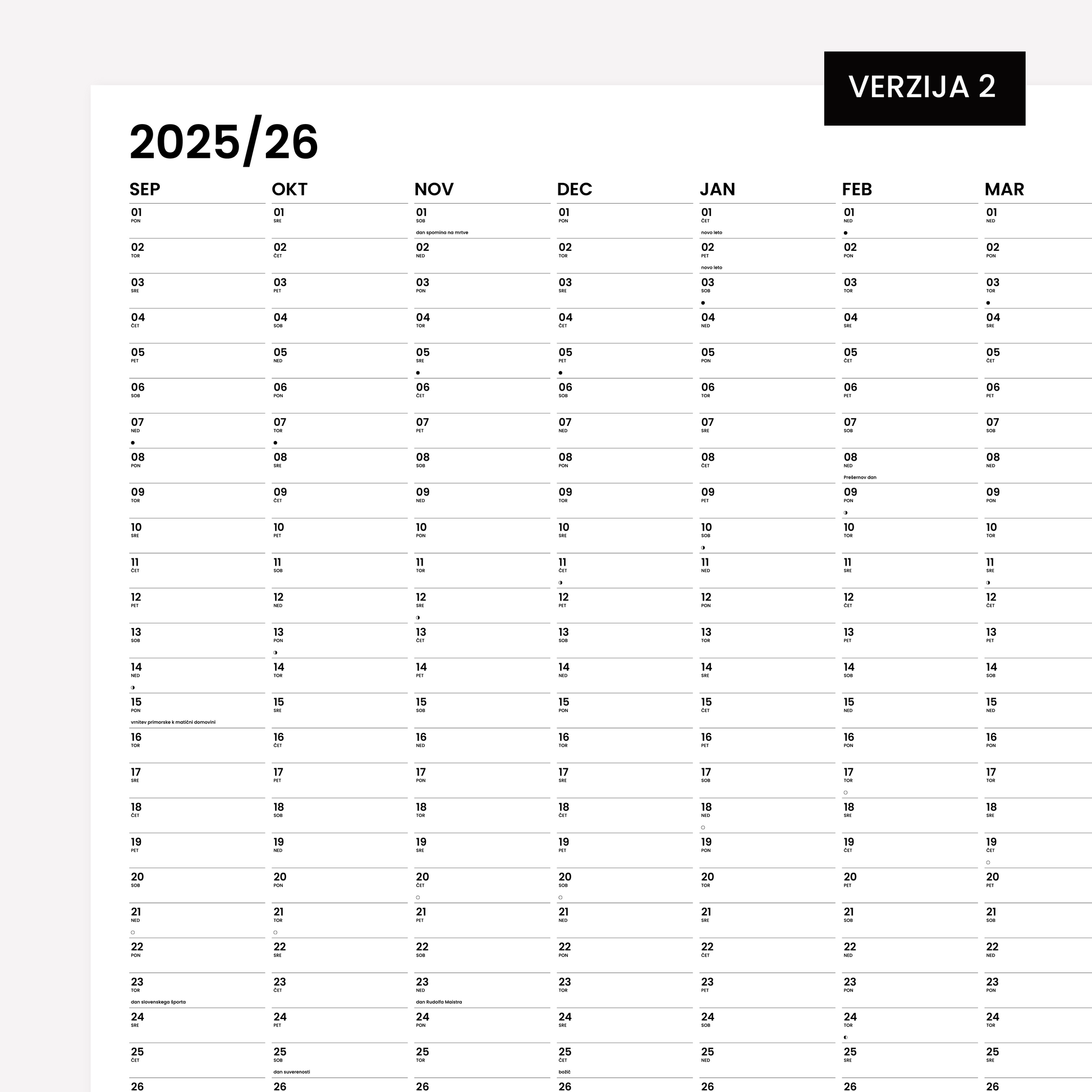Minimalistični dizajn s slovenskimi prazniki in luninimi menami, lahko pa si ga prilagodiš po svojih željah in dodaš še tebi pomembne datume.